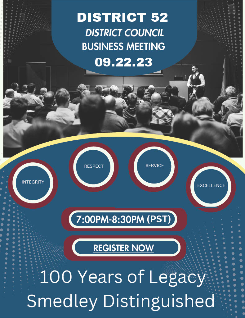 Calling all District Council Members. Registration is open now for the D52 Annual Business Meeting. You must register for the District Council Meeting in advance. Your registration and attendance are important to constitute the required quorum for the successful transaction of business at this meeting. REGISTER HERE