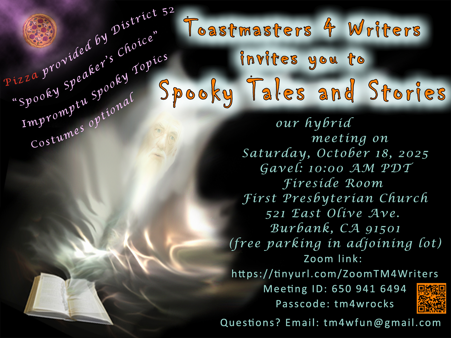 Join Toastmasters 4 Writers in person or on Zoom on Saturday, October 18th, at 10 AM PDT for our annual “Spooky Tales and Stories” hybrid party!
